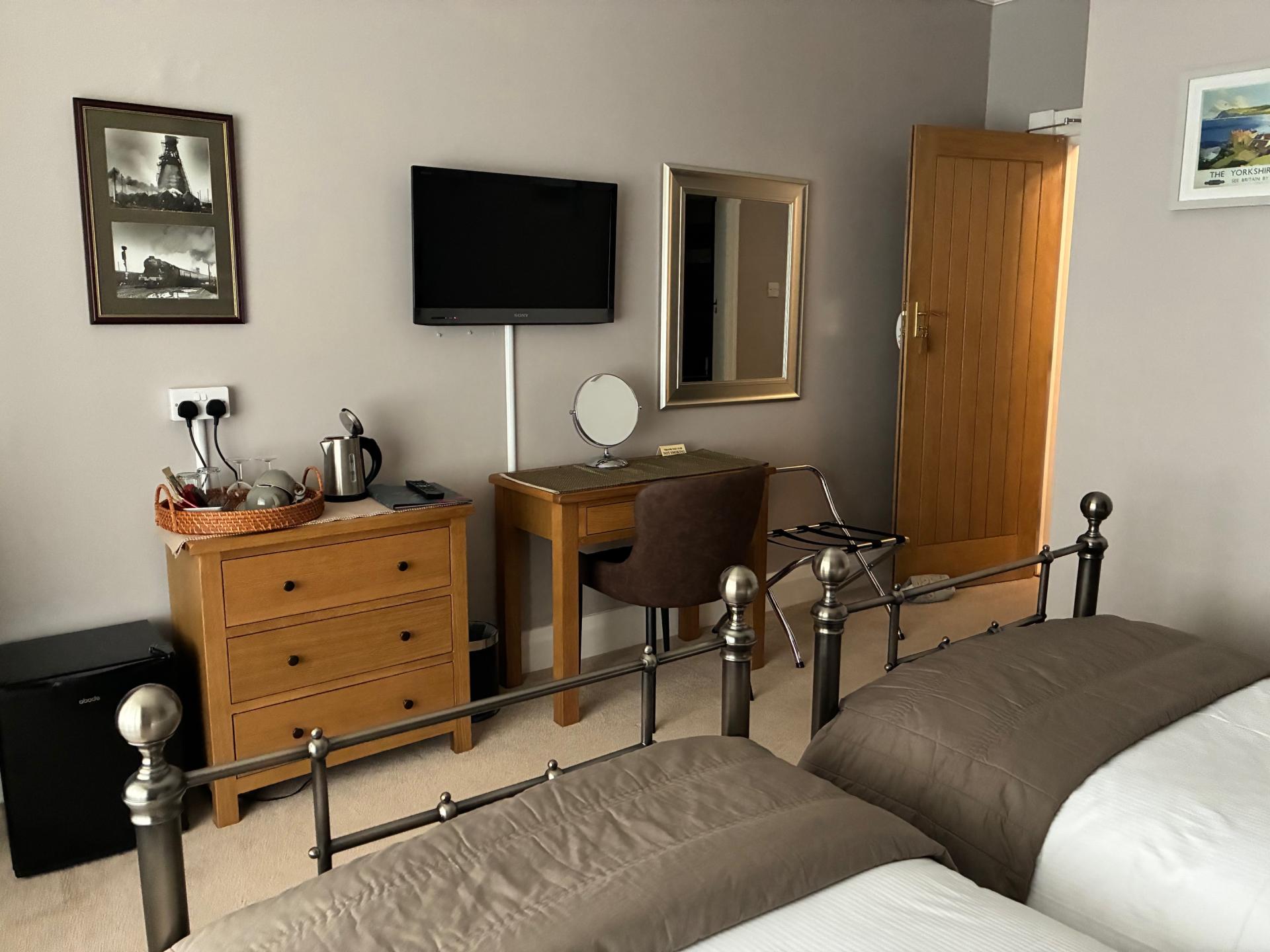 The refurbished en-suite has a modern walk-in shower, perfect for a refreshing start or end to your day. You’ll also find a hospitality tray with fresh milk, a mini fridge for your convenience, and a full English breakfast included in your stay.